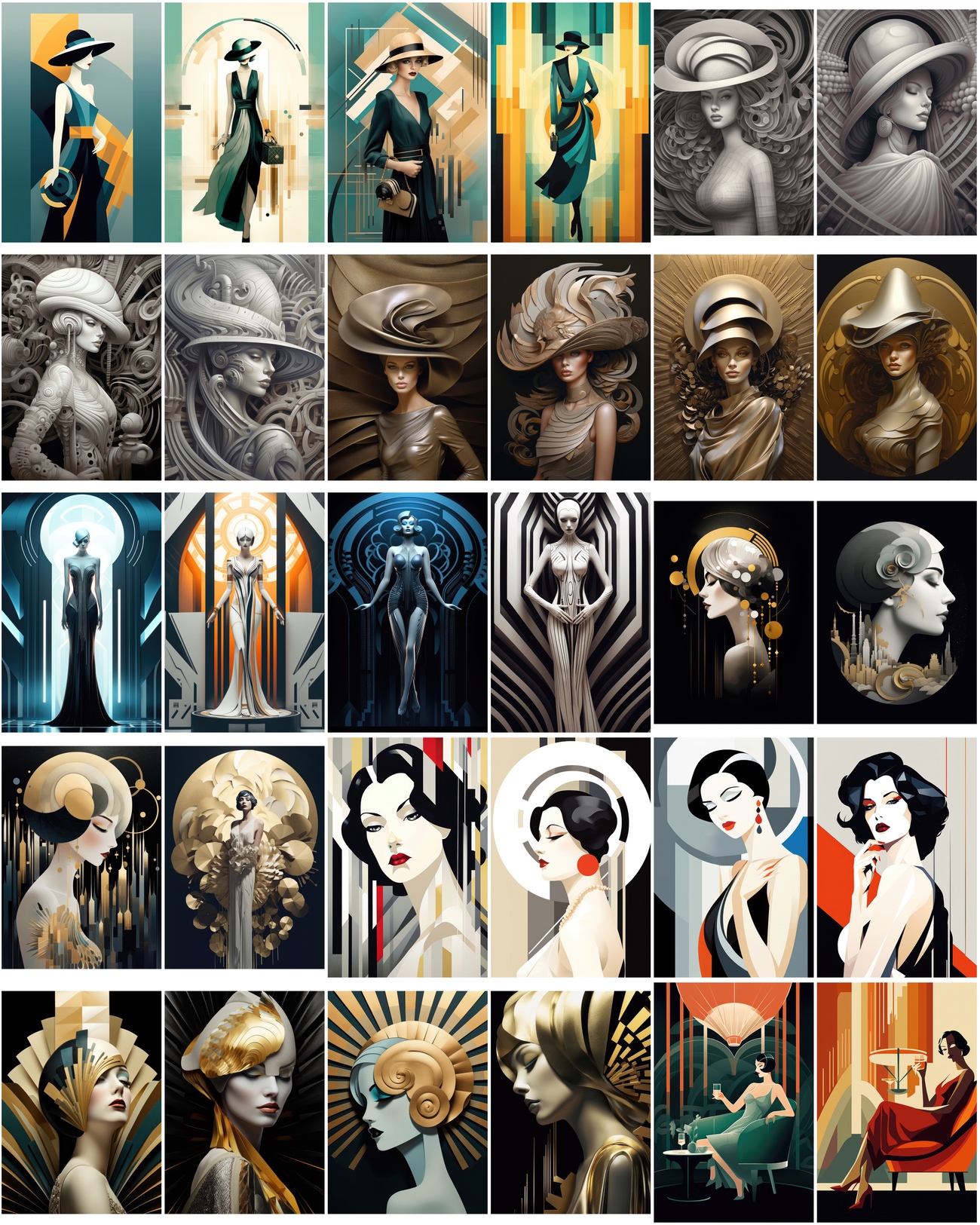 The women models portrayed in each image radiate sophistication and epitomize the quintessential style of the Art Deco period. These backdrops are versatile, making them suitable for everything from advertising materials and promotional goods to website banners, book covers, and beyond.