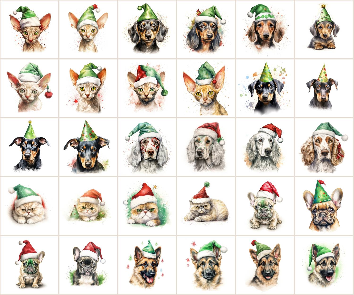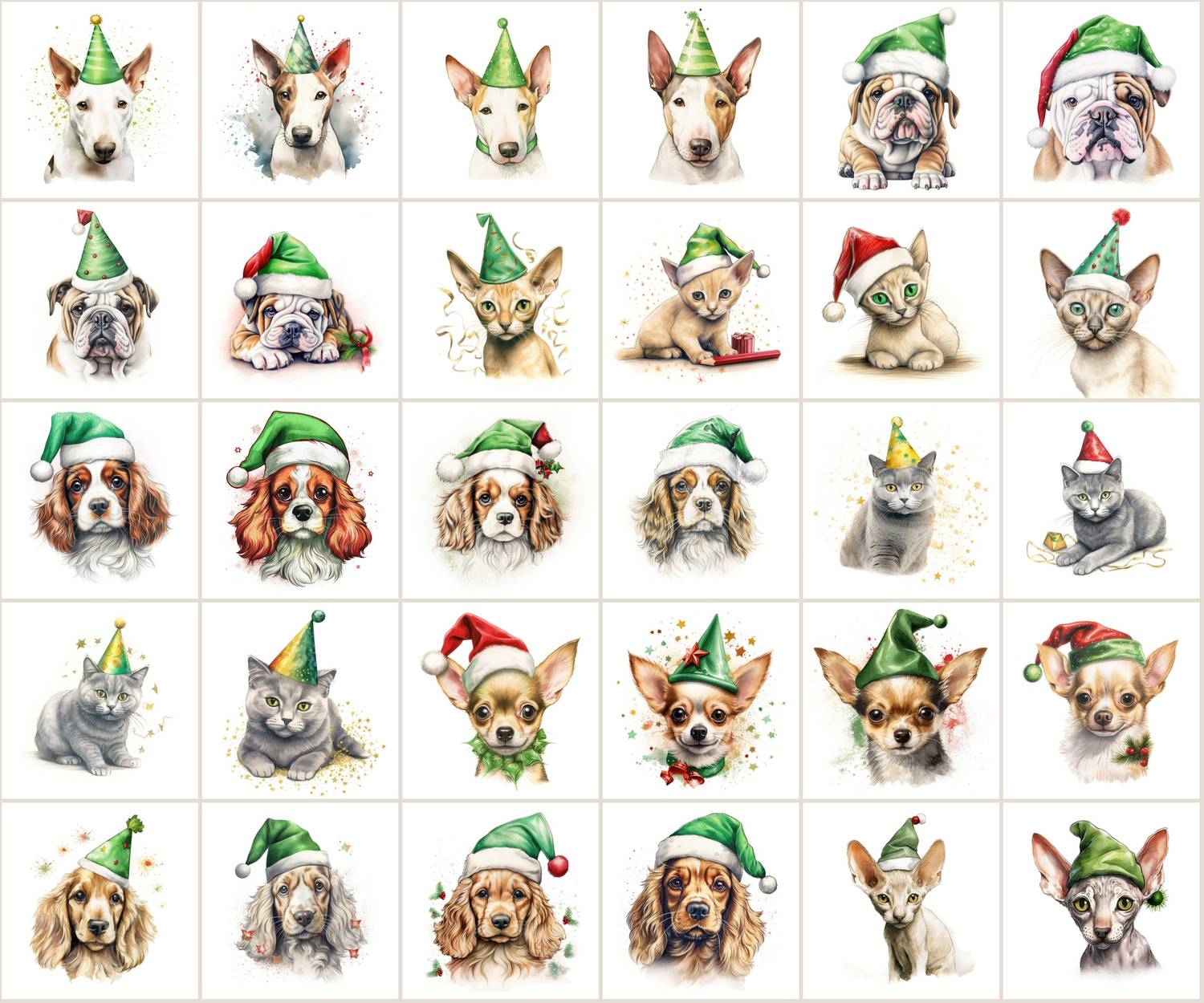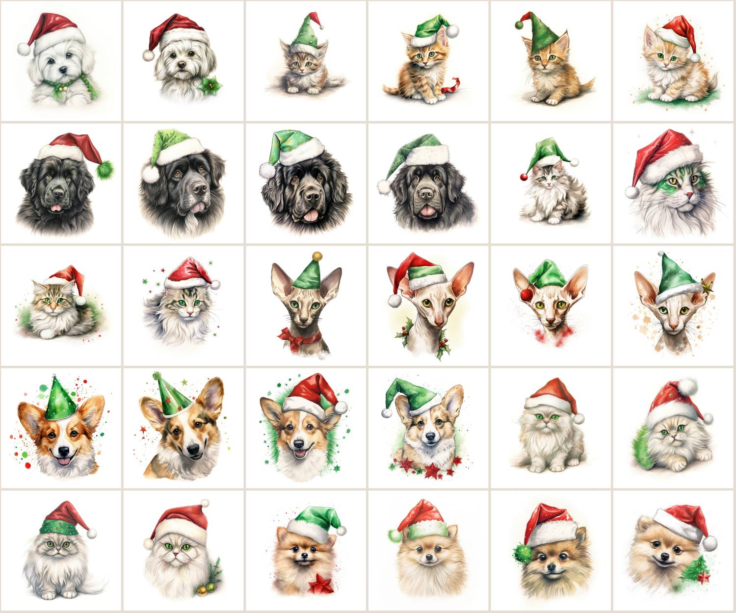 You will be able to get the 280 Animal Santa Hat PNGs: Dogs, Cats, Christmas Clipart, Commercial License Included.