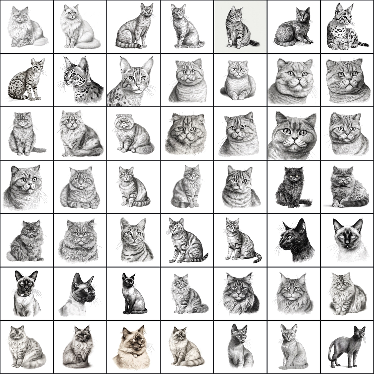 Dive into our exclusive assortment of high-resolution, meticulously hand-drawn cat sketches. Perfectly tailored for feline aficionados, this Cat PNG collection includes 590 distinct black and white images, each capturing a different cat breed with its unique and captivating charm. These adaptable graphics are perfect for your forthcoming creative venture, particularly those oriented towards pet-themed designs.