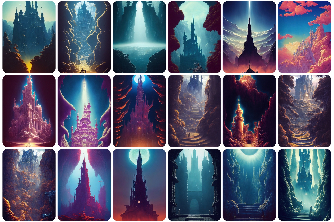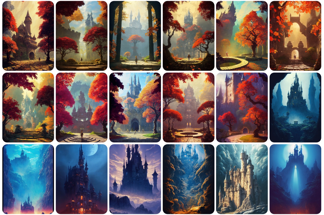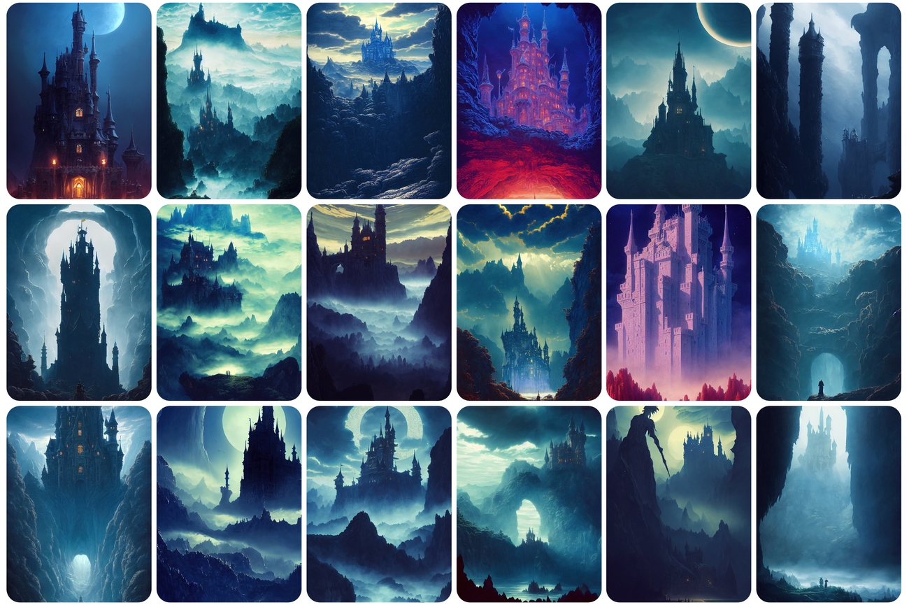 You will be able to download 130 UNIQUE castle images. You will get castles and ruins in dreamy surrealism with scenic background mountain landscapes.