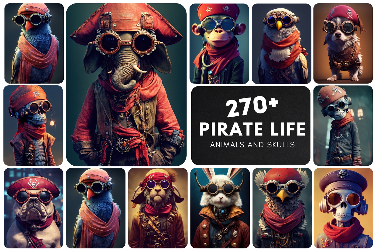It doesn't matter what you want to create, whether it's a simple print or a more complex website this bundle with cute pirate animals and skulls will bring you a lot of views.