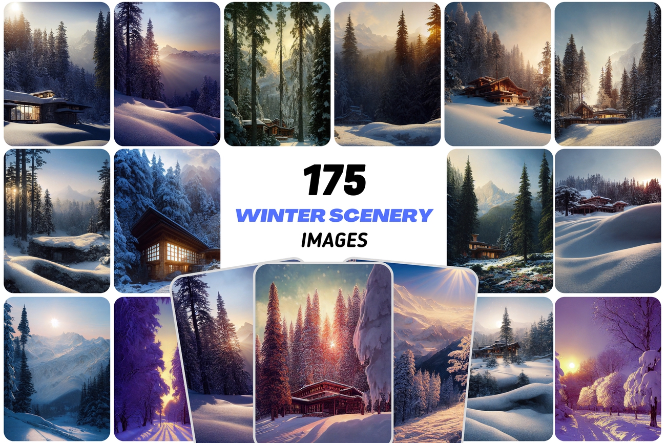 You can find 175 winter landscape images with mountains and trees full of snow. Download today this beautiful set with winter landscape images.