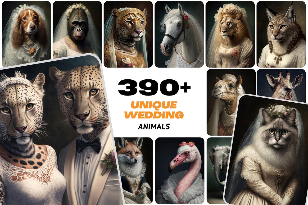 Introducing a unique collection of 390 photos of animals wearing gorgeous wedding clothes. Perfect for graphic designers, wedding and event planners, or anybody wishing to add a dash of whimsy to their projects.