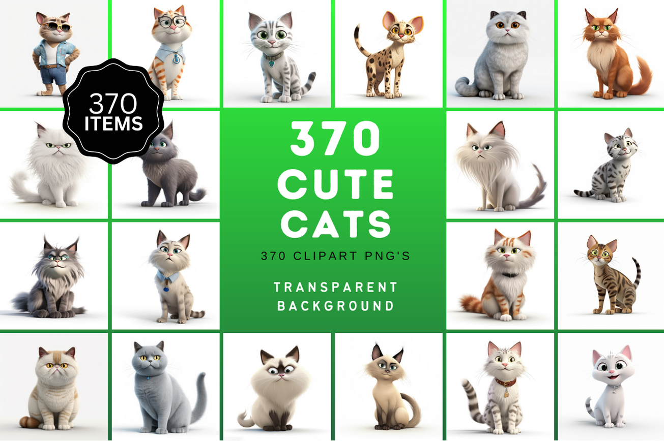 This exceptional collection comprises 370 high-quality, unique cat images in both 3D and cartoon styles.