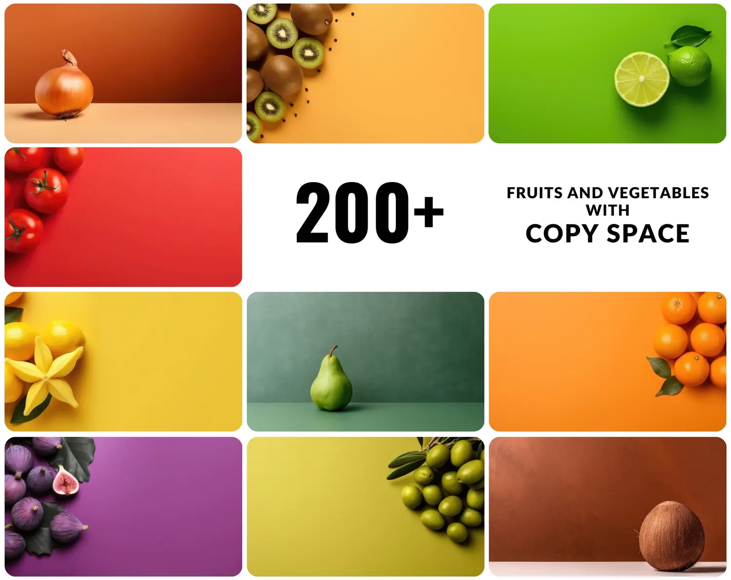 Add a splash of color and life to your projects with these 200 premium, high-resolution PNG images of fruits and vegetables. Each image is perfectly set against a vibrant, clean background to create a beautiful copy space for your text.